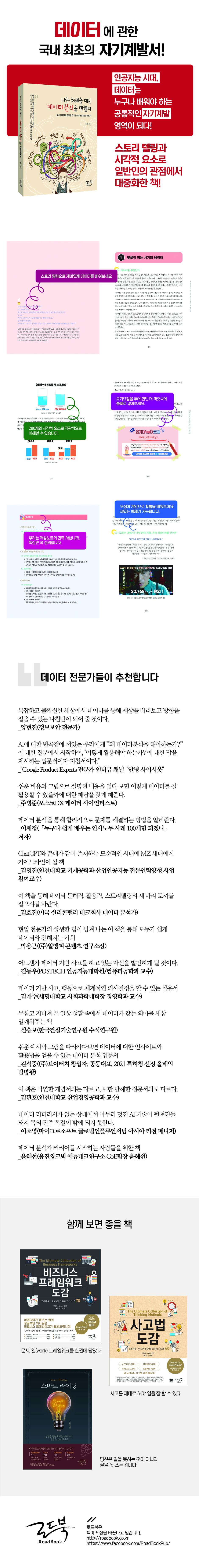 수년간 찾던 책을 이제야 만났다. 한 편에서는 플랫폼, 데이터, 인공지능, 다른 한 편에서는 문해력, 인문학적 소양이 주요 경쟁력이 된 격변의 시대다. 데이터가 막강한 힘을 가지게 된 세상에서 나침반이 되어 줄 필독서. 이 책을 통해 데이터 문해력, 활용력, 스토리텔링의 세 마리 토끼를 잡으시길 바란다.