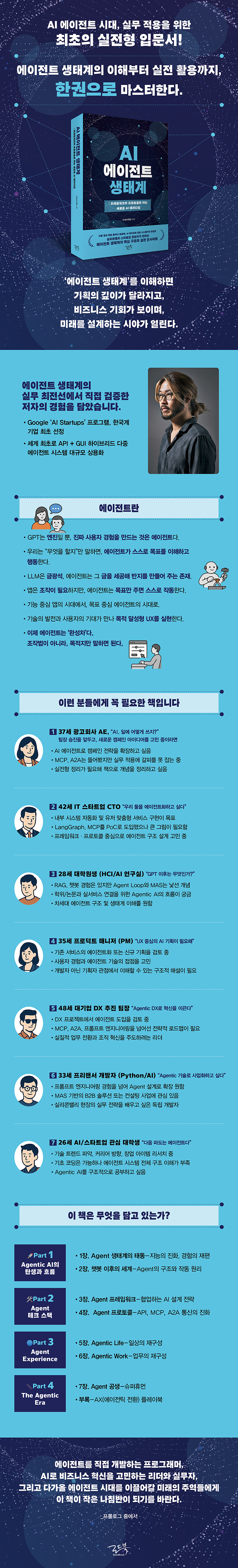 AI는 더 이상 연구실의 주제가 아니다. 이 책은 학생, 직장인, 창업가, 리더 모두를 위한 에이전트 시대의 실전 지침서다. 일상과 업무, 제품과 조직이 에이전트 중심으로 재편되는 시대의 생존 전략을 담았다.