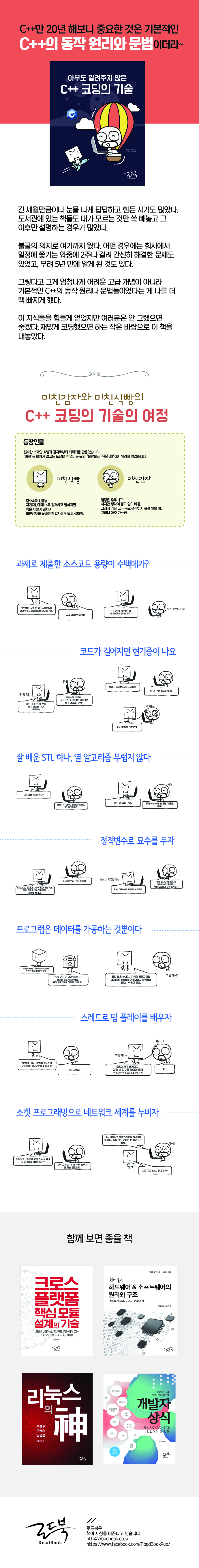 [주의] 만화와 같이 재밌는 그림들이 툭툭 튀어나온다고 해서 만화 책은 결코 아니다. 초보자를 위한 쉬운 책은 더욱 아니다. 20년간 C++을 해온 저자가 정말 쉽게 알려주고 싶은 핵심 비급 노트 같은 책이다.
